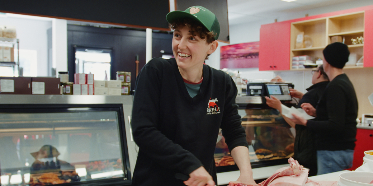 Dans un Québec où même les boucheries artisanales misent sur la viande industrielle, Renée LeBlanc-Paulin fait un choix radical : travailler uniquement avec des carcasses locales entières, qu’elle débite elle-même chaque semaine dans sa boucherie de Trois-Pistoles. Autour d’elle, un réseau de femmes engagées — cheffe, éleveuse, gestionnaire d’abattoir, cuisinière institutionnelle — l’aide à faire vivre un circuit aussi fragile que nécessaire. La bouchère de Trois-Pistoles suit leur lutte collective pour bâtir un modèle viable, à travers les embûches bien réelles que posent l’élevage, l’abattage, la transformation et la distribution de la viande locale.